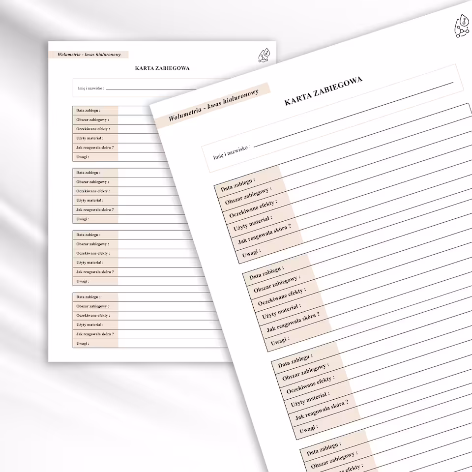 Cały pakiet DOKUMENTÓW ZABIEGOWYCH jest profesjonalnie zaprojektowany, łatwy do uzupełnienia i dostosowany do indywidualnych potrzeb salonu beauty. Wszystkie dokumenty są w formacie PDF, co umożliwia łatwe przechowywanie, drukowanie i udostępnianie klientom.