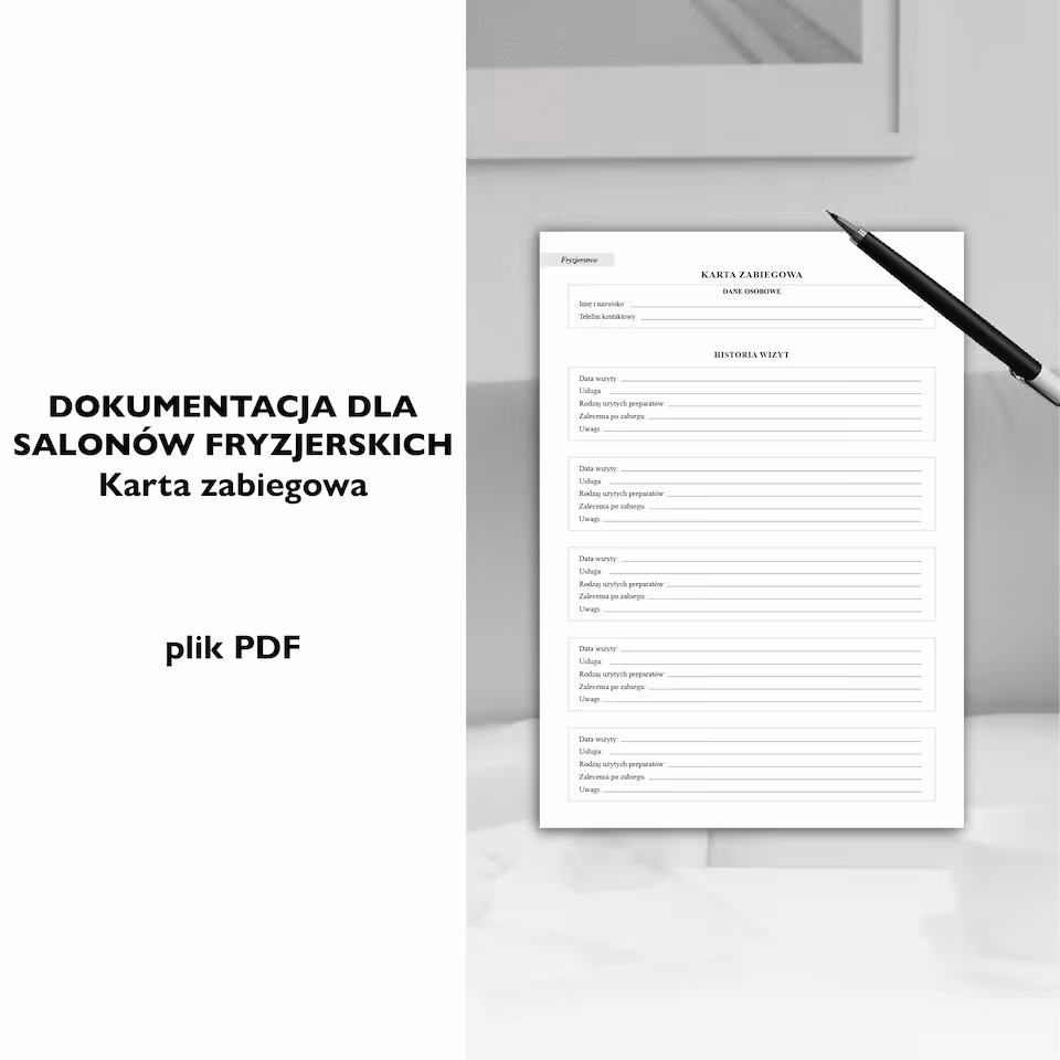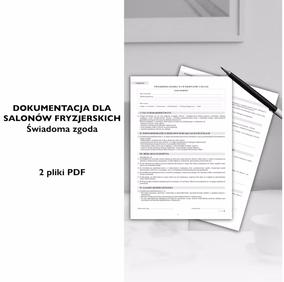 Pakiet dokumentacji do usług fryzjerskich – gotowy pakiet dokumentów (produkt cyfrowy - 5 plików PDF)