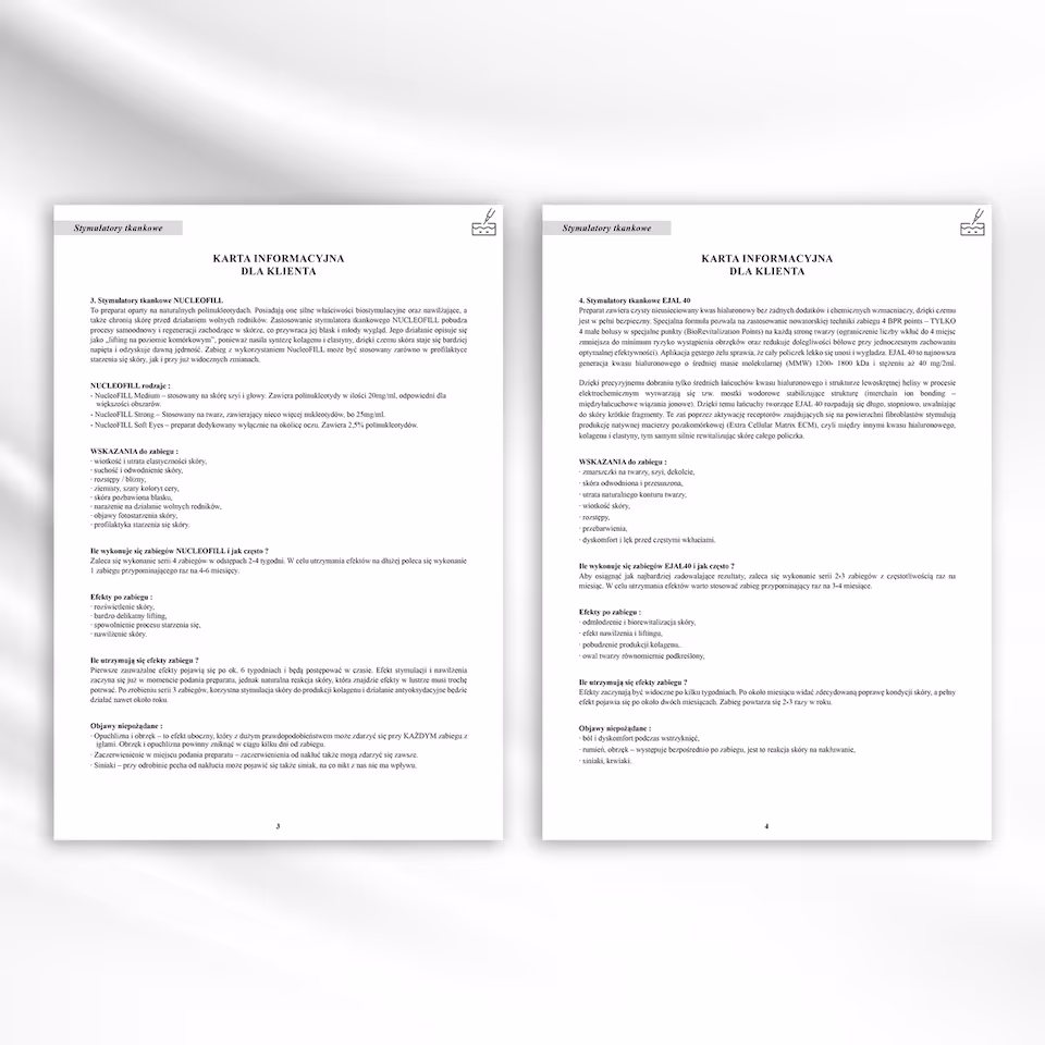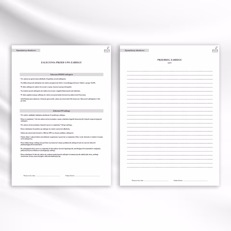 Cały pakiet dokumentów zabiegowych jest profesjonalnie zaprojektowany i łatwy do uzupełnienia. Wszystkie dokumenty są w formacie PDF, co umożliwia łatwe przechowywanie, drukowanie i udostępnianie klientom.